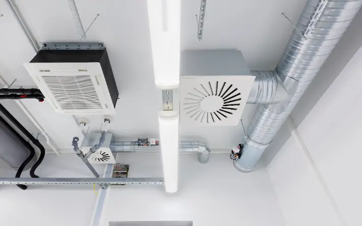 許多項目都傾向于選擇第三種方式。但需要注意的是,這種布局方式會減少下方上技術(shù)夾層(靜壓箱)的高度。為了確??諝饬鲃拥姆€(wěn)定性和日后的FFU日常維護,必須保持一定的凈高。根據(jù)合潔科技電子潔凈工程師的建議,最小的凈高應(yīng)為1.5米。
